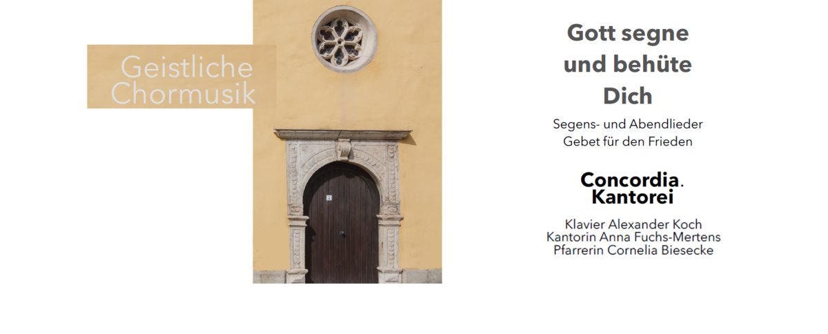 Am Sonntag, dem 16.11., gestaltet die Concordia-Kantorei einen abendlichen Gottesdienst in der Annenkirche. Gemeinsam mit Instrumentalisten bringt der Chor Segens- und Abendlieder zu Gehör und nimmt auch die Gemeinde mit in den gemeinsamen Gesang hinein. Die musikalische Leitung hat Kantorin Anna Fuchs-Mertens. Beginn ist um 17 Uhr.